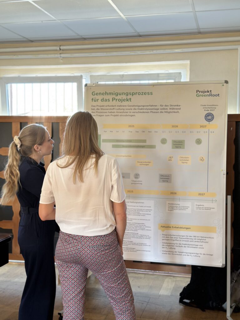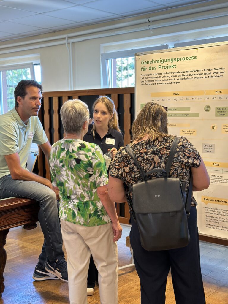 Wir haben das Projekt anhand von Infotafeln vorgestellt. Diese thematisieren unter anderem die Technologie der Elektrolyse, den Projektüberblick und die räumliche Einordnung sowie den Genehmigungsprozess für das Projekt. Sie können die Tafeln hier einsehen.